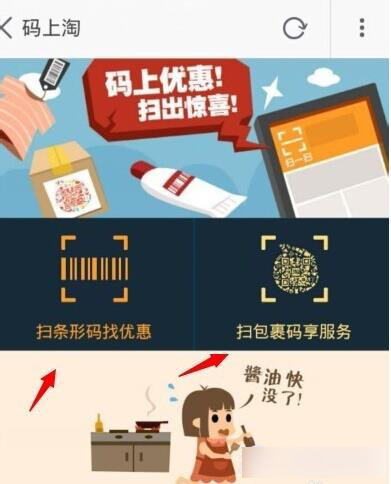 二,进入码上淘后可以通过【扫条形码找优惠】或是【扫包裹码享服务】。由于我现在手上没有包裹没有办法演示。下面我使用一个商品扫它的条形码来演示。