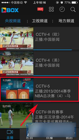 1)首先下载【央视影音】,然后点击进入。在主界面选择自己需要预约的节目,在这笔者使用CCTV5频道来给大家演示下吧!选择【CCTV5】进入。(如下图所示)