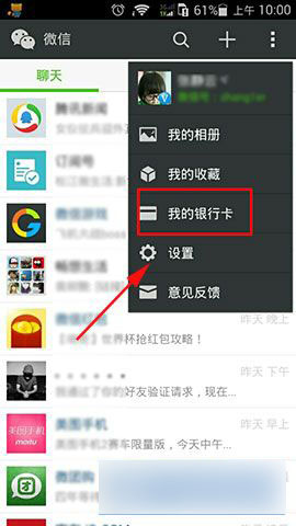 1)首先打开“微信”,然后在微信右上角的“...”中点击进去,在“...”中我们可以看到“我的银行卡”,然后点击进入“我的银行卡”。(如下图所示)