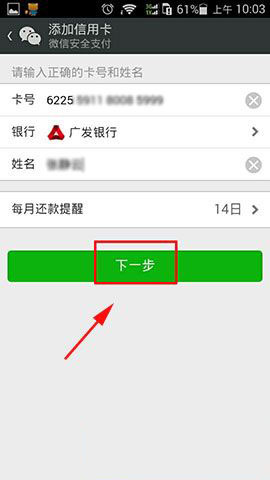 2)在“我的银行卡”中,我们可以看到“信用卡还款”这个一选项,点击进去,然后添加信用卡,输入卡号、姓名、跟每月还款日期提醒,填写完成之后,然后点击确定,就可以成功的添加完银行卡了。(如下图所示)