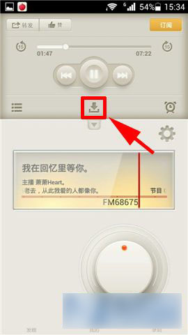 1)打开荔枝FM,然后在听到需要下载的节目的时候点击上方正中间的【下拉按钮】。(如下图)