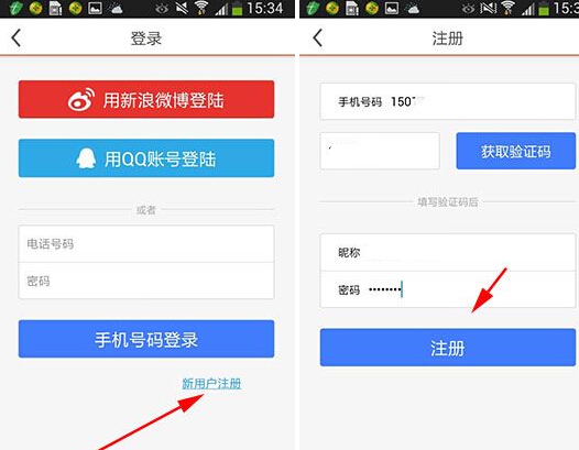 2、点击“新用户注册”,输入你的手机号码以及验证码,再输入昵称跟密码,最后点击“注册”即可。