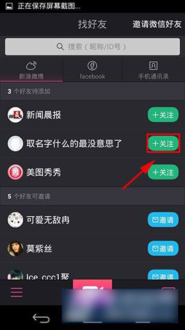 2)然后点击进入“找好友”,我们可以看到“新浪微博”这一选择,然后在好友在右边点击“关注”就可以成功的添加完成微博好友了。(如下图所示)