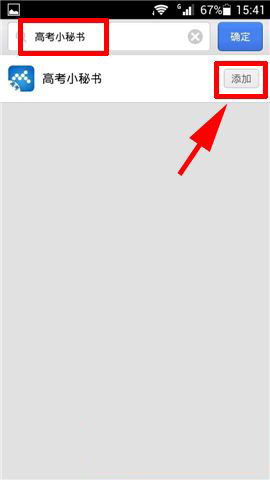 2)点击右上角【放大镜】进入搜索,然后在输入框输入【高考小秘书】并点击【确认】进行搜索,然后在搜索到高考小秘书点击右侧【添加】。(如下图)