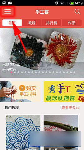 1)首先在手机桌面点击打开“手工客”,打开以后点击左上角的一个“菜单”标志(三横图形)。(如下图所示)