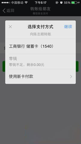 3)如果自己的微信上还有零钱的话,可以使用零钱转账,如果自己微信钱包里没有零钱,大家可以选择已经绑定的银行卡进行转账或者使用新卡付款。(如下图所示)