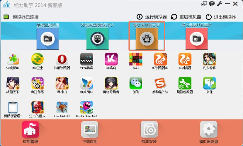 1、作为一个十分给力的重要插件,安卓模拟器按键大师集成在《给力助手2014新春版》,在“应用管理”界面的大图标中就能方便找到;