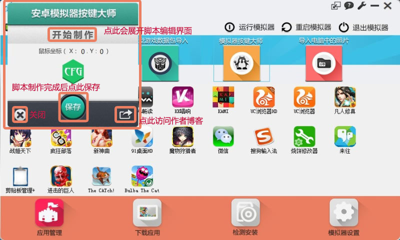 2、点击该按钮,就会弹出安卓模拟器按键大师的软件操作界面,其各项功能如下图: