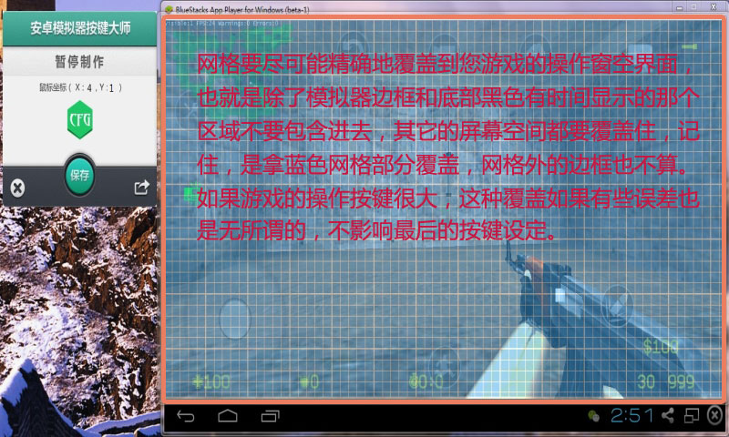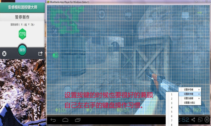 4、因为网格窗是半透明的,所以您可以看见下方的游戏按键位置,左键点击该位置即可,如果某些按键是具有上下左右功能的屏幕摇杆,在设定的时候务必对准好方向感应区;