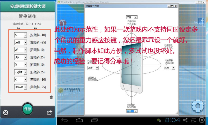 11、由于手机实际上的陀螺仪重力感应功能更为灵敏复杂,单纯以键盘模拟,未必能一步到位,需要根据进游戏后的体验来进行微调修正,此类脚本建议多做几次以及同时另存一个备份,已选择体验最好的来使用;