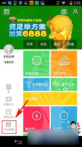 1)打开【新浪彩票】,点击左下角【比分直播】;(如下图所示)