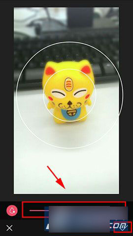 3)我们可以看到这个光圈,我们可以在下方选择光圈大小,然后光圈范围的图片是清晰的。其余的图片就是模糊的了,编辑完成之后,点击右下角的【√】,然后点击右上角的保存就可以把编辑好的照片保存起来了。(如下图所示)