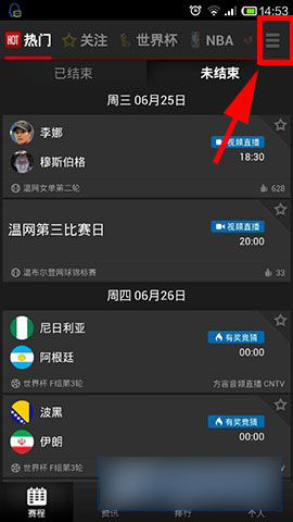 1)首先在手机桌面打开【腾讯看比赛】,然后点击屏幕右上方【菜单】!(如下图所示)