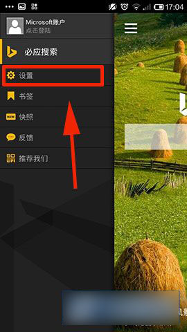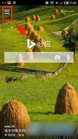 1)首先在手机桌面打开【必应】,然后点击左上方【菜单】(如左上方没有【菜单】标识请随意点击屏幕任何地方一次【菜单】即会出来)(如下图所示)