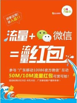 中国移动广东分公司联合微信正式推出流量红包业务,用户关注“广东移动10086”官方微信公众号后,参与“抢流量红包”活动,可低价购买小额流量包。除了用户本人使用,流量包也能以微信红包形式向朋友圈、群组或好友派发。
