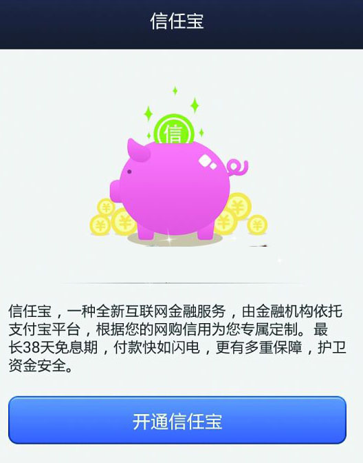 信任宝是一种全新互联网金融服务,由金融机构依托支付宝平台,根据客户的网购信用专属定制。“最长38天免息期,付款快如闪电,更有多重保障,护卫资金安全。”其中,“最长38天免息期”,与2013年支付宝宣传的“信用支付”提法一样。