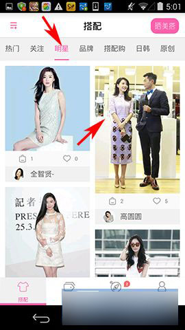 1)打开【穿衣助手】,点击【搭配】,选择你要搭配的明星、品牌等。(如下图所示)