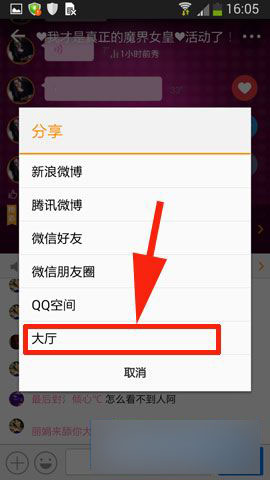 3)接下来选择【分享】点击,然后选择你想要分享的方向点击进入(在这里小编就简单点分享到友加大厅吧)(如下图所示)