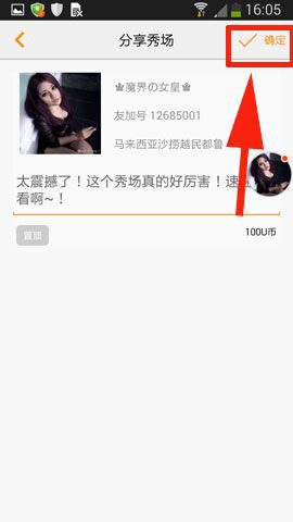 4)点击进去以后点击屏幕右上方【确定】即可完成分享。(如下图所示)