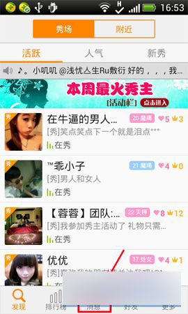 1)首先打开友加软件,进入首页,点击“消息”按键,在消息界面,按“三角”按键。(如下图所示)