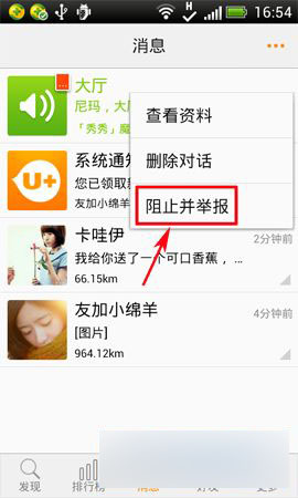 2)然后在功能列表中点击“阻止并举报”按键,最后在显出的界面中按“确定”按键。(如下图所示)