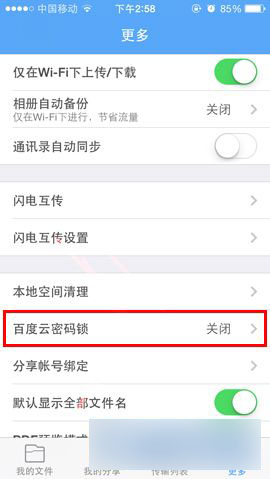 2)在【更多】界面里,选择【百度云密码锁】功能即可进行对手机百度云密码锁设置了。(如下图所示)
