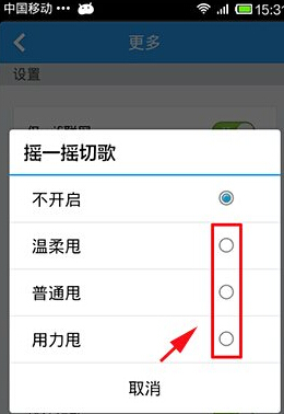 3、里面有【温柔甩】,【普通甩】,【用力甩】三个选项可供你选择,设置好后如你不想听这首歌时可以甩下你的手机,这时就可以切换到另外一首歌了。