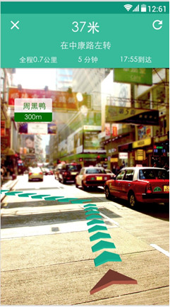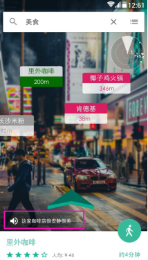 开屏一出现就是AR界面,随着一道绿色的光扫描而过,AR界面上的商家标签慢慢呈现出来,分别是美食8个,酒店,公交,厕所,景点,超市各一个,都是附近优先推荐的商户。