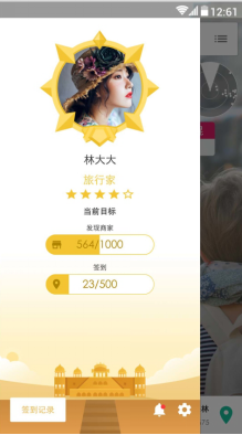向右滑动主页屏幕,可查看个人主页,了解自己的战绩,升级目标,个人头像,勋章等,一目了然。还能在此界面查看自己的签到记录。每次点签到后选择地点,会能为你加2分探索值。
