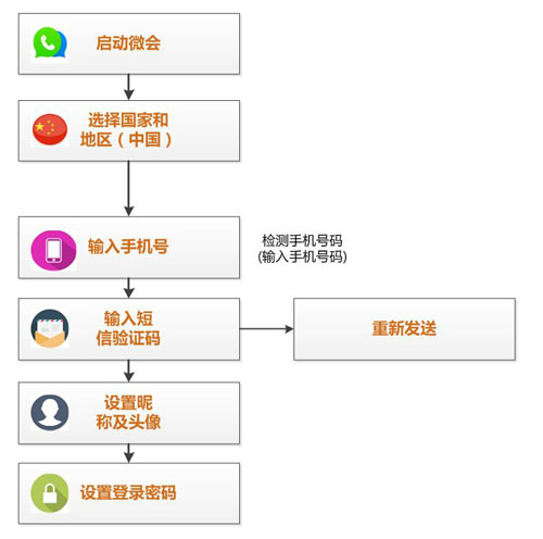 启动—选择地区—输入手机号—输入短信验证—设置头像—设置密码