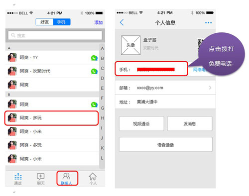 微会通讯录联系人,点击进入详情即可直接拨打免费电话