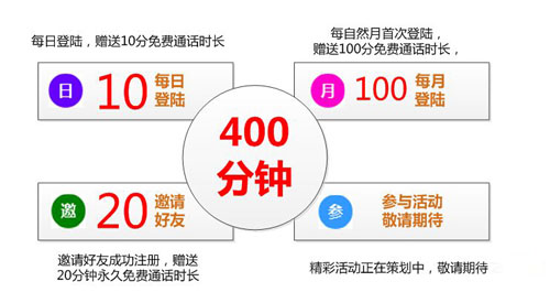 每人每月基础400分钟免费通话时长,月末清零,其中邀请好友赠送时长除外。