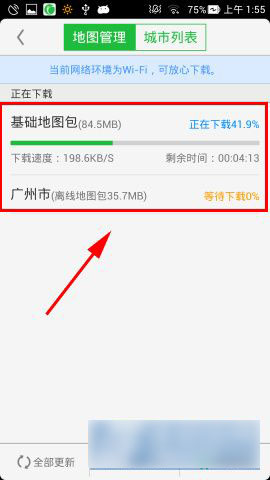 3)点击【广州市】下载地图,点击【地图管理】可查看下载情况(如下图)