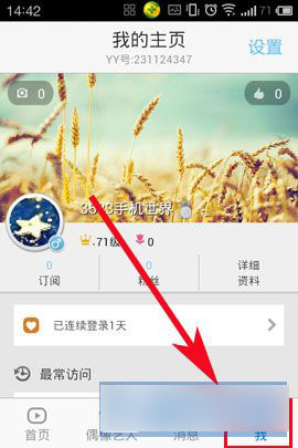 1)打开自己手机的YY软件,店家屏幕下方【我】(如下图所示)