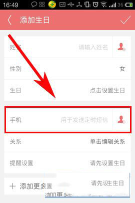 2)在添加生日界面有各种添加朋友生日的办法,小编选择其中一种示范【手动添加】,点击进去之后填写要添加人的信息,如果还要更加详细,或者到时要提醒请点击【手机】