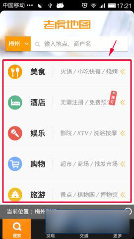 1)打开手机老虎地图软件,在软件界面点击你需要查询的分类。如小编选择的“美食”。(如下图所示)