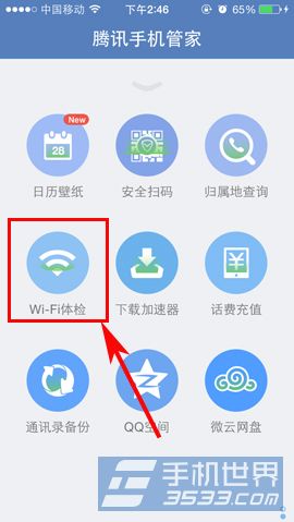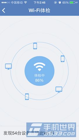 2)滑动至菜单栏低2页后,点击【Wi-Fi体检】,届时,大家只需要等到即可,手机关键将会检测你现在所连接的网络连接设备情况。(如下图所示)