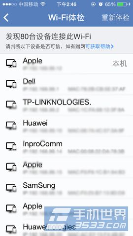 3)待检测完成,大家就能看到现在你所处网络环境里到底有多少设备正在连接,如果发现不是自己的设备连接,那么可以很荣幸的告诉你,你被蹭网了。(如下图所示)