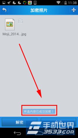 2)点击【╋】,在添加提示框中选择【从相册选择】,选择好自己的图片,但可见【所选内容成功加密】(如下图)