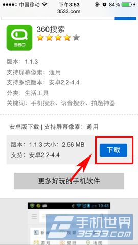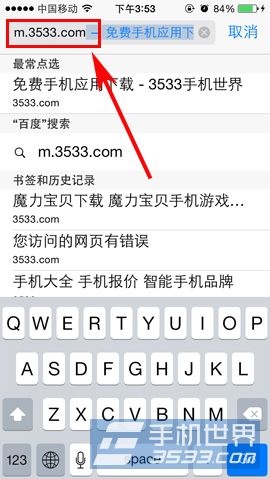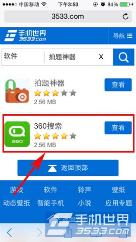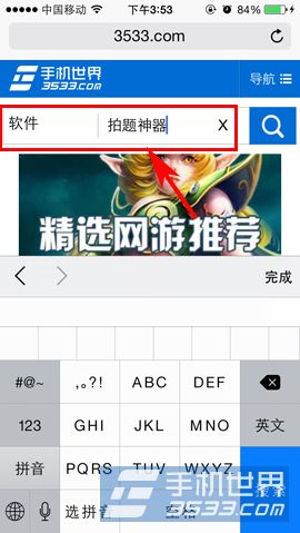 1)首先,打开手机浏览器,输入:m.3533.com进入手机世界移动版。在搜索框里输入【拍题神器】进行搜索。(如下图所示)