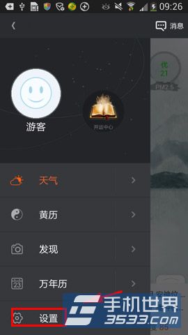 1)安装并打开缘天气,在主界面中点击【菜单】,点击【设置】。(如下图)