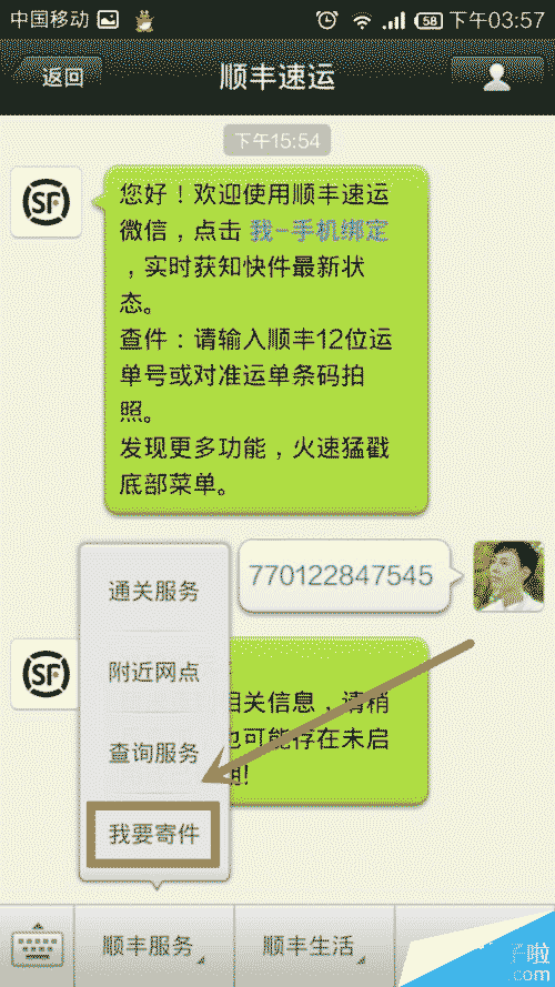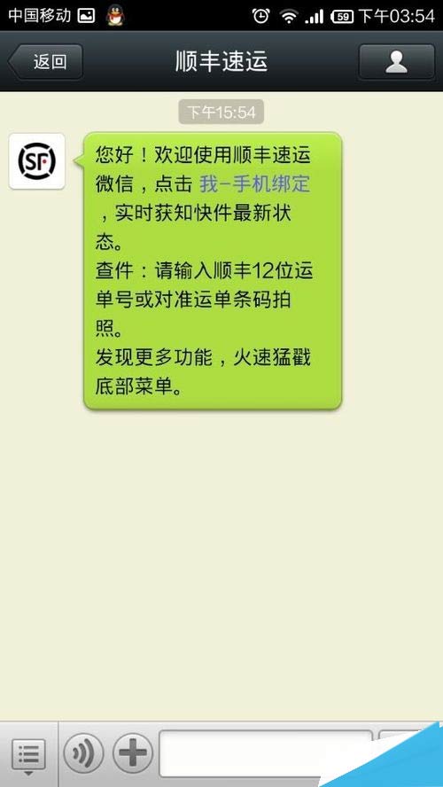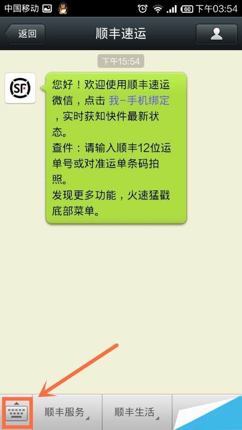 回到顺丰速运公众号的会话界面,点左下角的图标,切换到输入状态,如下图