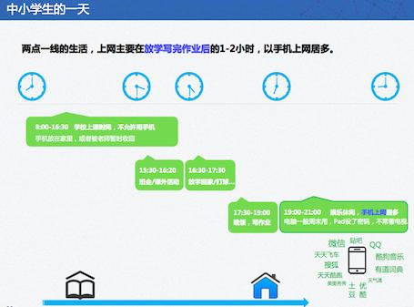 中国目前K12人口约为1.5亿,小学生的手机持有率在40%,中学生的持有率在60~70%,其使用行为要受到家长与老师的限制,并有如下几个显著特点: