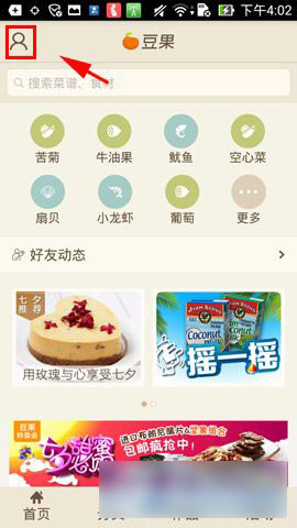 1)安装并打开豆果美食,在主界面左上角中,点击【人物】(如下图)