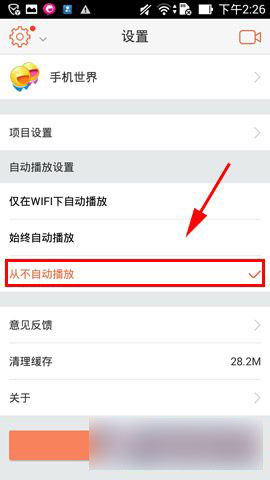 2)在列表中选择【设置】把【仅在WIFI下自动播放】修改成【从不自动播放】选项即可(如下图)