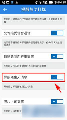 2)在设置面板中选择【提醒与防打扰】,进入后点击【屏蔽陌生人消息】使其为激活状态即可(如下图)