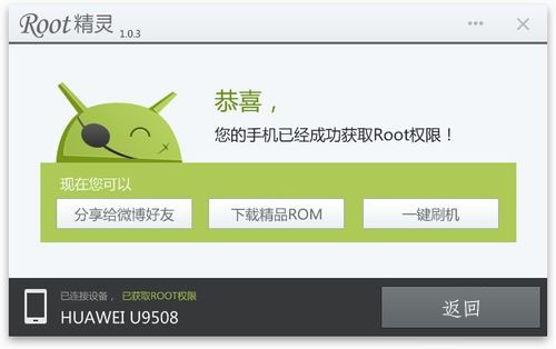 6.ROOT成功后会提示“恭喜您的手机已获得ROOT权限”,ROOT成功后还可以分享给微博好友、刷入精品ROM、一键刷机等操作。