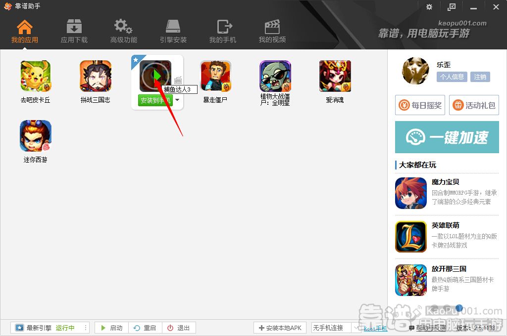 1、在【我的应用】中,任意启动一款游戏(请玩家养成从靠谱助手下载游戏的好习惯哟~):