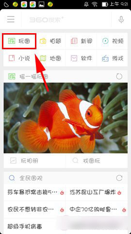 1)首先在手机桌面打开【360搜索】,进去以后点击屏幕上方【玩图】。
