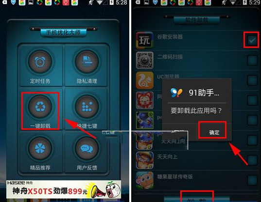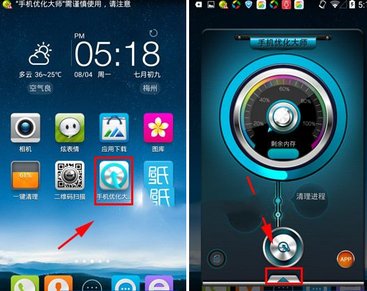 手机优化大师一键卸载功能使用教程1)安装并打开手机优化大师,按方向箭头滑动主界面(如下图)